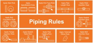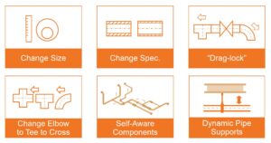 - Funkce šetřící čas: Automatické trasování potrubí, konfigurovatelná pravidla potrubí, návrh řízený specifikacemi, samo-vědomé chování komponent, jedním kliknutím aktualizace modelu – například Change Size, Change Spec – vše přispívá k úspoře času a zefektivnění pracovních postupů při návrhu.